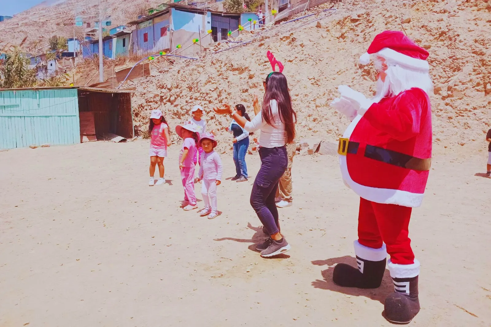 Contagiados del espíritu navideño un grupo de colaboradores de la “Red de Alegría”, ofrecieron la tradicional chocolatada navideña y entrega de regalos a los niños y niñas de Manchay, principales actores de esta fiesta, por lo que, entre payasos, dalinas y papá Noel, los niños soltaron carcajadas, corrieron y bailaron con los villancicos, además de recibir regalos y degustar la rica chocolatada y panetones.