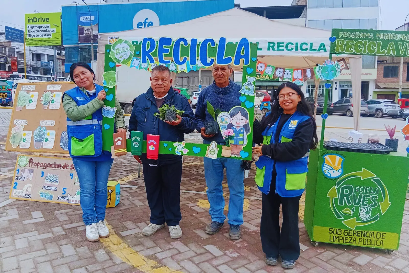 Al frontis de la Municipalidad de Villa El Salvador, el programa Recicla VES organizó una campaña de reciclaje y un Taller de Germinación de Semillas. “Estamos realizando una campaña de Eco Trueque que consiste, básicamente, en que el vecino traiga su reciclaje, ya sea botella de plástico, botella de vidrio, cartones, latas, cuadernos y a cambio se les estaría entregando compost, bolsitas de tocuyo y plantas ornamentales. El objetivo es que se reduzca drásticamente la basura”, señaló Laura Ayala, promotora ambiental de Recicla VES.